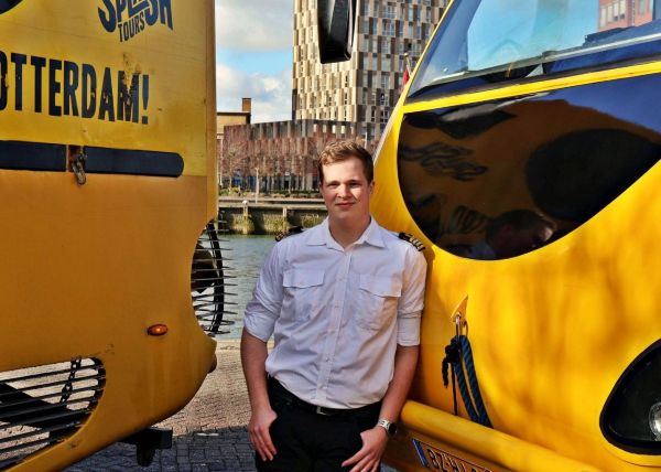 „We zijn hartstikke trots op hem”, meldt zijn werkgever Christoffel Wielders (47) voorafgaand aan de tocht. Wielders is directeur-aandeelhouder van Rotterdam Leisure Group, waar Splashtours deel van uitmaakt. Lucas kwam begin vorig jaar op zijn 20ste binnen, meteen als ’s lands jongste kapitein-chauffeur: Splashtours is de enige exploitant van amfibiebussen in Nederland.