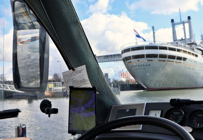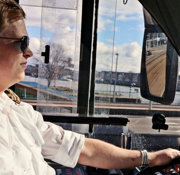 Zonder van zitplaats te veranderen, wisselt Lucas hierbij van functie: zojuist stuurde hij als chauffeur het amfibievoertuig door de stad; nu dobberen we in de Nieuwe Maas en draagt hij de kapiteinspet. Figuurlijk dan.